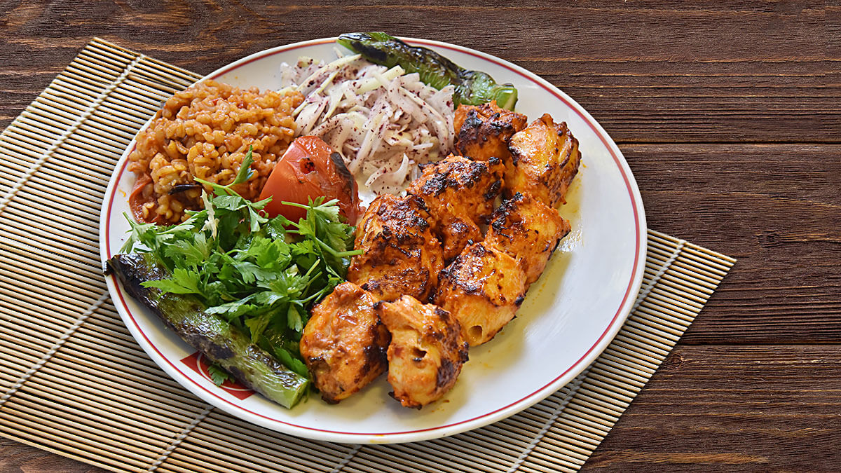 170 Gr. Tavuk Tikeleri, Pervaz, Közlenmiş Domates ve Biber, Kebap Mezeleri ile Servis Edilir.