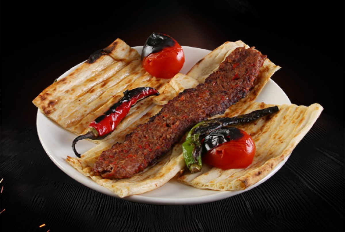 160 Gr. Kıyma, Pervaz, Közlenmiş Domates ve Biber, Kebap Mezeleri ile Servis Edilir.